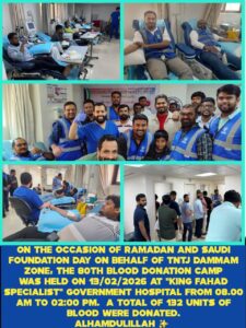 தமிழ்நாடு தவ்ஹீத் ஜமாஅத் தம்மாம் மண்டலம் சார்பாக வருகின்ற ரமலான் மற்றும் சவூதி நிறுவன தினம் (FOUNDATION DAY) முன்னிட்டு 13/02/2026 (வெள்ளிக்கிழமை) அன்று “கிங் பஹத் ஸ்பெஷலிஸ்ட்” அரசு மருத்துவமனையில் காலை 08.00 மணி முதல் மதியம் 02:00 மணி வரை சிறப்பாக நடைபெற்றது.